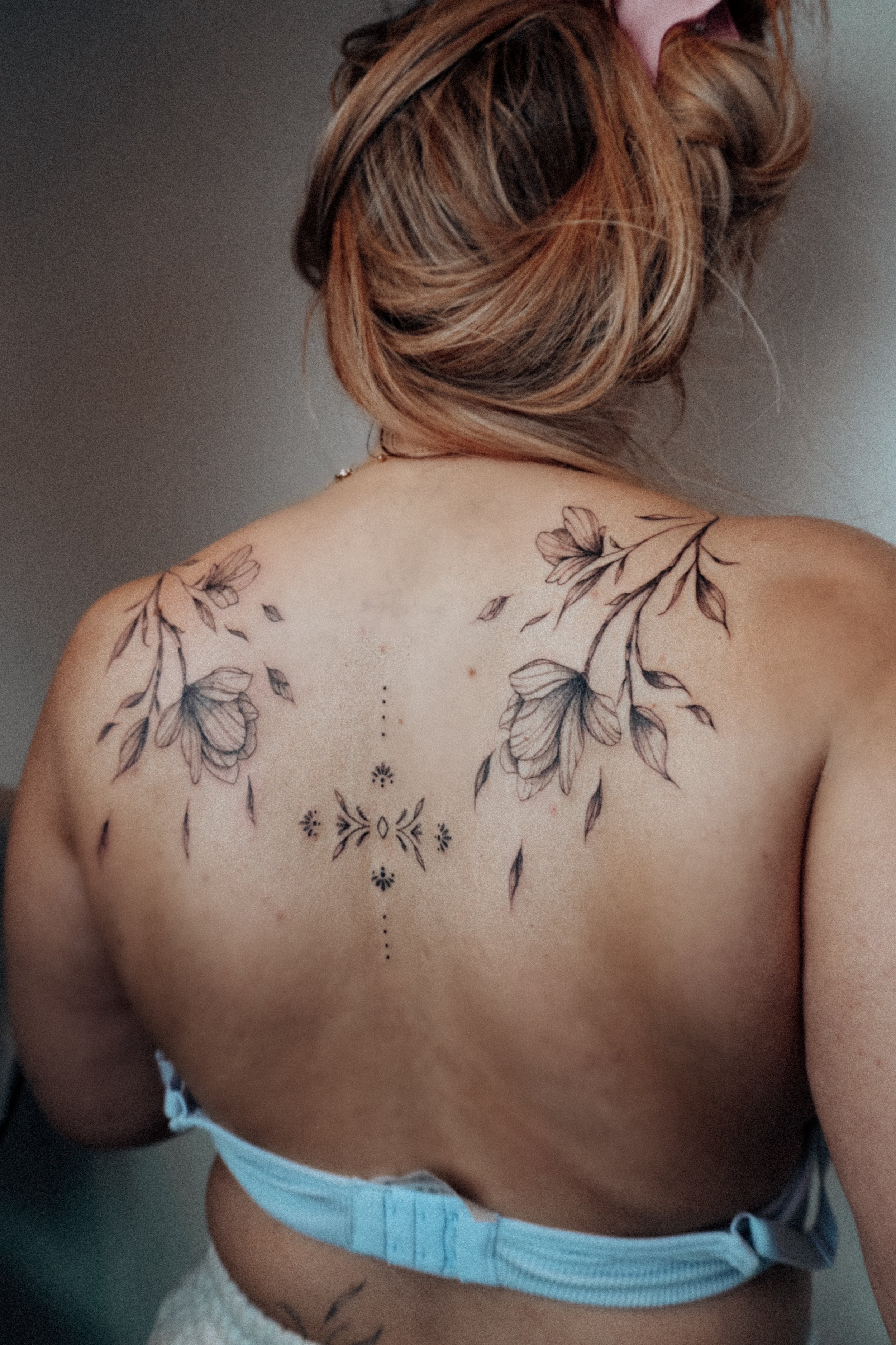 Flowers flow naturally with the body’s shape, making them ideal for areas like the ribs, arms, shoulders, collarbone, and hips.